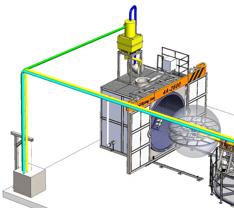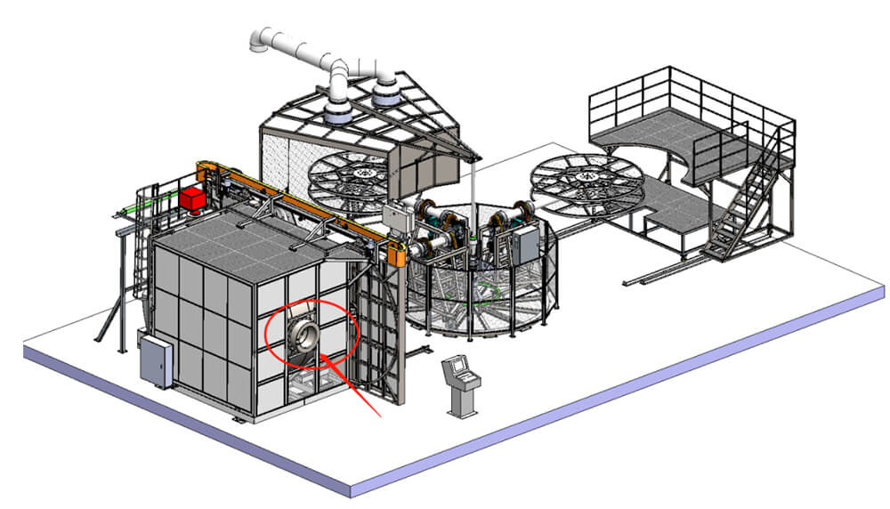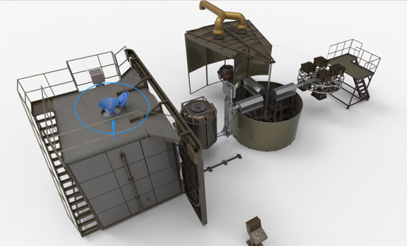 烘箱頂部預留開口,配合轉臂定位,通過加料漏斗將粉料注入對應模具內(nèi)。這種方式保證了烘箱內(nèi)持續(xù)高溫,減少能耗,操作更加安全,是目前使用較為廣泛的一種方式。