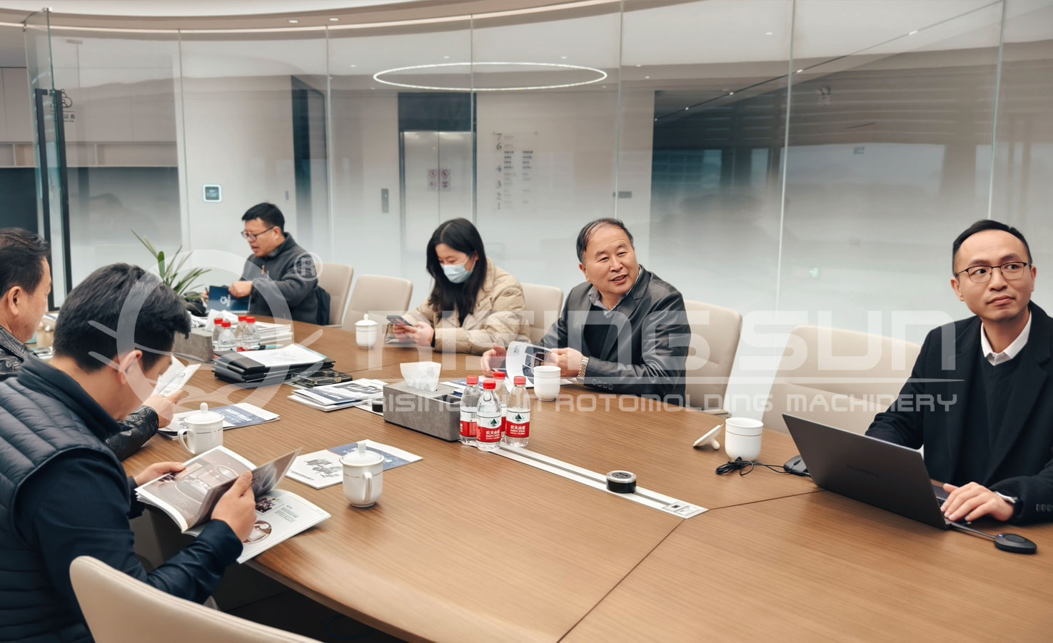 參觀結(jié)束后,雙方在會(huì)議室進(jìn)行了座談交流。座談會(huì)上,企業(yè)負(fù)責(zé)人朱總詳細(xì)介紹了公司的生產(chǎn)情況和市場布局,重點(diǎn)講述了公司在滾塑機(jī)械、模具和制品設(shè)計(jì)開發(fā)方面的核心競爭力,以及近年來在文旅行業(yè)、智能化生產(chǎn)和環(huán)保技術(shù)上的創(chuàng)新成果。