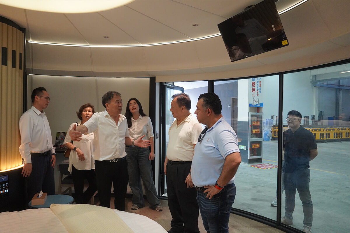 2024年5月26日,美亞裔房地產(chǎn)協(xié)會(huì)會(huì)長(zhǎng)江喬平先生一行蒞臨公司,就公司的明星產(chǎn)品——旅游度假屋、星月居系列以及星舟系列進(jìn)行了深入的考察與交流。