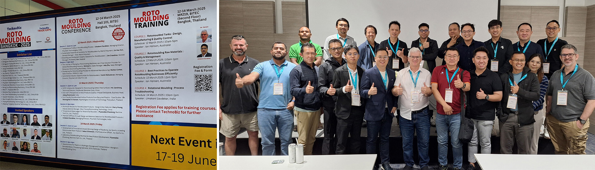 雖然他能說英語(yǔ),但他理解口語(yǔ)(和閱讀英語(yǔ)單詞)的能力要強(qiáng)得多。培訓(xùn)研討會(huì)與貿(mào)易博覽會(huì)同期在曼谷國(guó)際貿(mào)易展覽中心(BITEC)的一個(gè)獨(dú)立會(huì)議室舉行。貿(mào)易博覽會(huì)涵蓋了滾塑、水和廢水處理、回收利用、聚氨酯技術(shù)、綠色技術(shù)、粘合劑和涂料等多個(gè)行業(yè)。滾塑博覽會(huì)共有20家參展商,其中11家來(lái)自中國(guó),4家來(lái)自印度,4家來(lái)自泰國(guó),1家來(lái)自意大利。貿(mào)易博覽會(huì)是一個(gè)充滿活力的平臺(tái),能夠促進(jìn)各種規(guī)模和行業(yè)的企業(yè)的增長(zhǎng)、創(chuàng)新和合作。通過將專業(yè)人士、客戶和利益相關(guān)者聚集在一起,這些活動(dòng)可以為參與者提供豐富的機(jī)會(huì)。滾塑貿(mào)易博覽會(huì)和滾塑培訓(xùn)研討會(huì)于3月12日至14日舉行,為期三天。星期三和星期四是全天培訓(xùn),由 Ian Hansen(RotoConsult – 澳大利亞)主講,星期五是半天培訓(xùn),由 Umakant Savdekar(Phychem – 印度)主講。這使得 Ricky 和其他研討會(huì)參與者有時(shí)間在展會(huì)最后一天(星期五下午)參觀貿(mào)易博覽會(huì)。他們有機(jī)會(huì)在貿(mào)易博覽會(huì)上聆聽 SCGC ICO Polymers 供應(yīng)商關(guān)于氫氣罐的演示。在培訓(xùn)研討會(huì)上,Ricky 和他的團(tuán)隊(duì)沉浸在一個(gè)充滿潛力和可能性的世界中。不同的會(huì)議涵蓋了從如何使用 ASTM D1998 計(jì)算水箱壁厚到優(yōu)化循環(huán)時(shí)間的所有內(nèi)容。經(jīng)驗(yàn)豐富的滾塑專家演示了溫度控制或粉末質(zhì)量的微小調(diào)整如何對(duì)實(shí)現(xiàn)一致的質(zhì)量結(jié)果產(chǎn)生重大影響。Ricky 還參加了培訓(xùn)期間的問答活動(dòng),在那里他學(xué)會(huì)了如何避免常見缺陷并嘗試創(chuàng)新設(shè)計(jì)。但部分奇跡發(fā)生在社交休息期間。 Ricky與其他滾塑專業(yè)人士建立了聯(lián)系——其中一些是經(jīng)驗(yàn)豐富的老手,而另一些則是充滿新想法的新手。他們分享了故事、挑戰(zhàn)和解決方案。