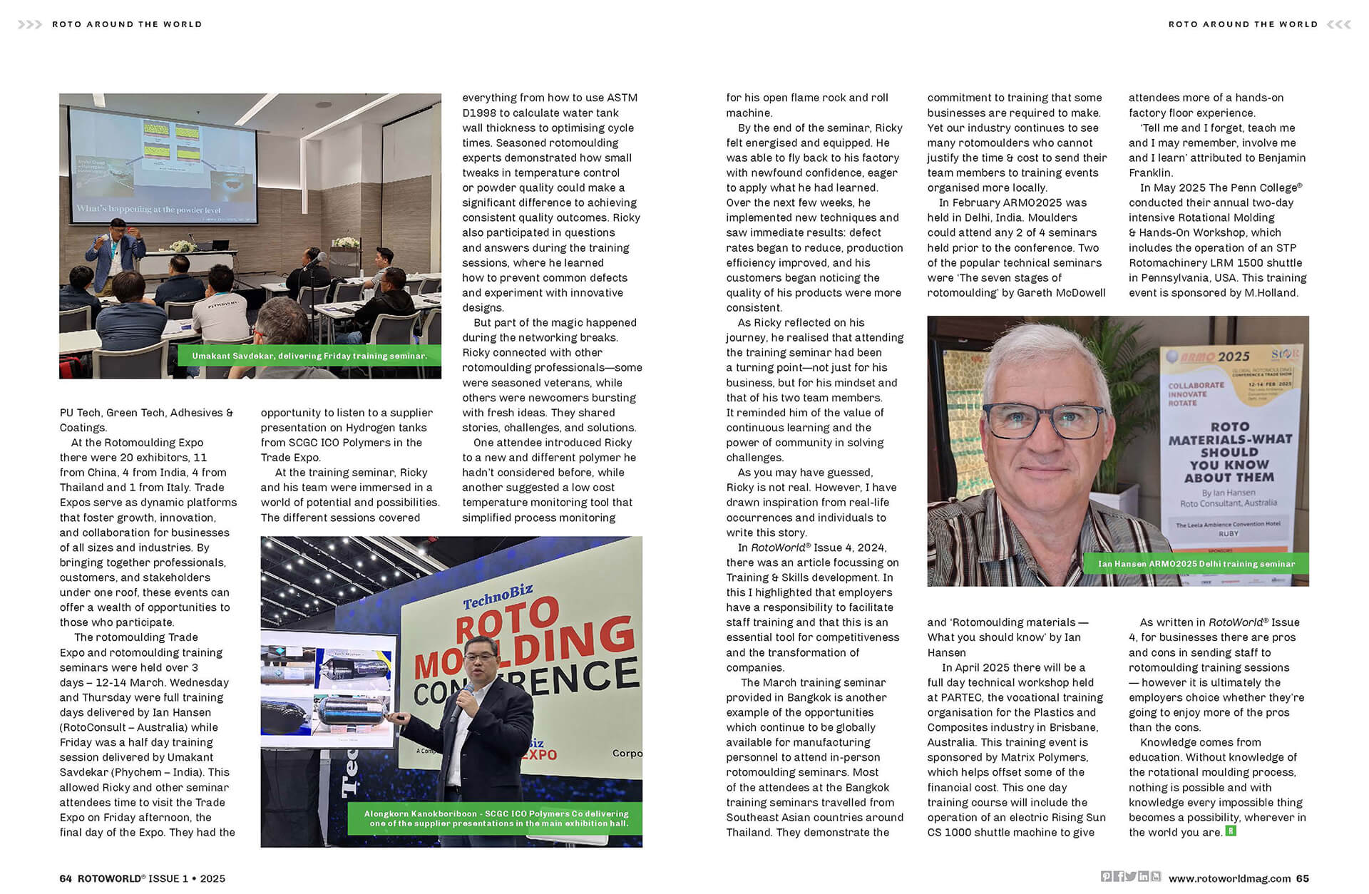 三月份在曼谷舉辦的培訓(xùn)研討會(huì)是全球制造業(yè)人員繼續(xù)有機(jī)會(huì)參加面對(duì)面滾塑研討會(huì)的另一個(gè)例子。曼谷培訓(xùn)研討會(huì)的大多數(shù)與會(huì)者來(lái)自泰國(guó)各地的東南亞國(guó)家。他們展示了和“滾塑材料——你應(yīng)該知道什么”作者:Ian Hansen 2025 年 4 月,澳大利亞布里斯班塑料和復(fù)合材料行業(yè)職業(yè)培訓(xùn)機(jī)構(gòu) PARTEC 將舉辦一整天的技術(shù)研討會(huì)。該培訓(xùn)活動(dòng)由 Matrix Polymers 贊助,這有助于抵消部分財(cái)務(wù)成本。這個(gè)為期一天的培訓(xùn)課程將包括操作電動(dòng) Rising Sun CS 1000 穿梭機(jī),正如 RotoWorld? 第 4 期所寫,對(duì)于企業(yè)而言,派員工參加滾塑培訓(xùn)課程有利有弊——但最終由雇主選擇他們是否享受更多的利大于弊。知識(shí)源于教育。