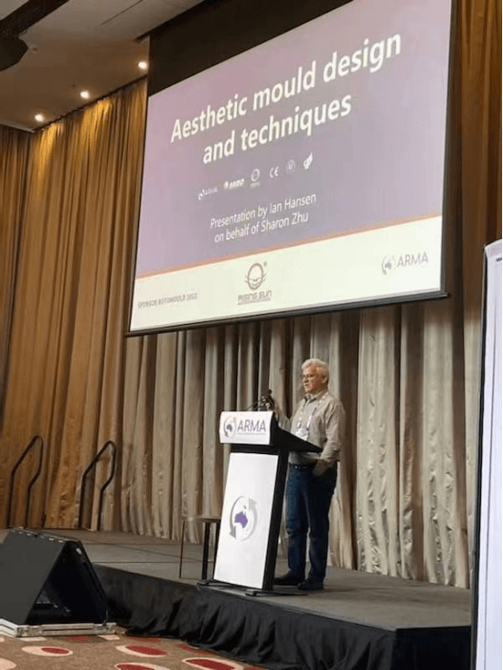 雖然因?yàn)橐咔樵?,旭日滾塑代表不能親臨現(xiàn)場。但是澳洲滾塑專家Ian Hansen代表旭日做了關(guān)于《滾塑鐵模加工成型美學(xué)》的主題演講,獲得了在場觀眾的一致好評。