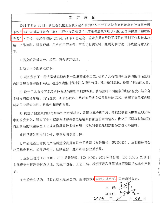 2024年8月30日,溫嶺市旭日滾塑科技有限公司工程副總與技術(shù)員一同前往杭州參與浙江省工業(yè)機(jī)械聯(lián)合會組織召開的首臺(套)產(chǎn)品工程化攻關(guān)項目驗收匯報。旭日滾塑工程副總在會上詳細(xì)介紹了工程化攻關(guān)項目“大容量儲氫瓶內(nèi)膽(IV型)全自動控溫滾塑成型設(shè)備”的主要創(chuàng)新點(diǎn)。