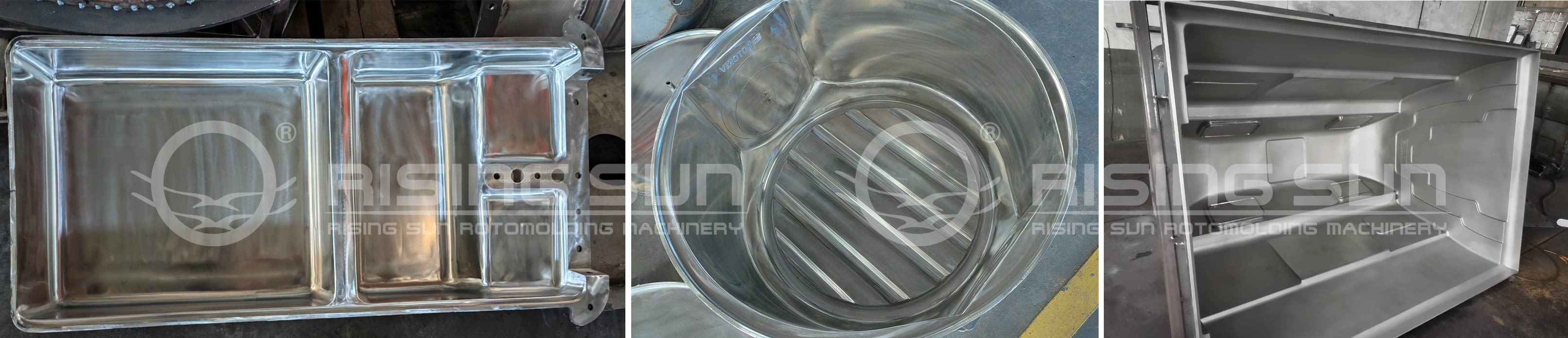 旭日滾塑生產(chǎn)的不銹鋼模具采用高端加工技術(shù),融合了數(shù)控加工、數(shù)控旋壓、機械拉伸、機械切割等多種加工工序,而非簡單的手工錘擊。因此,我們的模具加工精度和成型效果極高,堪比鋁制模具。